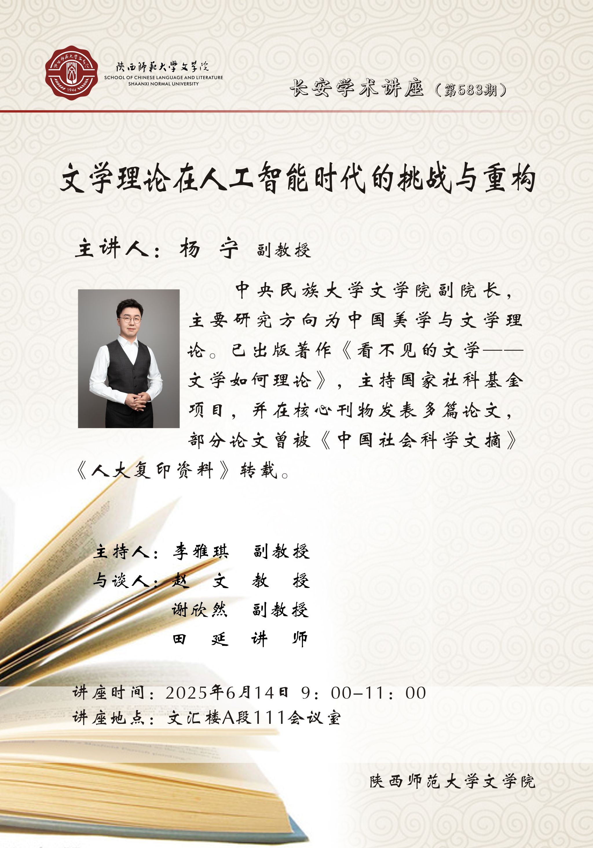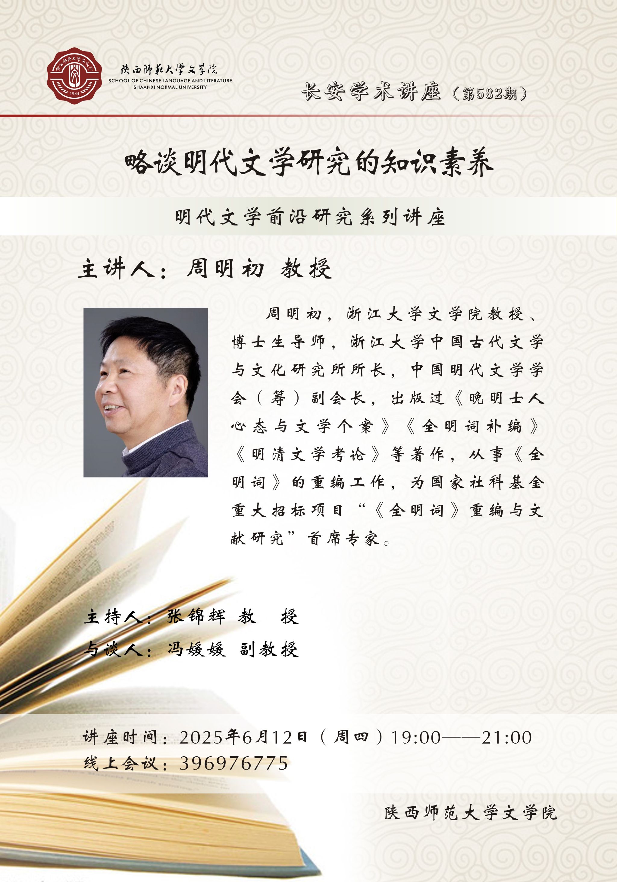 (通讯员:乔月)2025年6月29日晚,由公司主办的明代前沿系列讲座暨长安学术讲座第591期“‘叙议’与‘公私’:唐宋派记体文创作刍议”顺利举办。讲座邀请首都师范大学刘尊举教授作为主讲人,公司周广干副教授主持,何悦玲副教授、师海军教授与谈,来自全国各高校近100名师生在线参与。讲座伊始,刘尊举教授援引叶晔教授做讲座时提到的“显微”理念,认为对于明代文学史、流派、具体创作现象的认知,本身就是一个显微的途径。刘教授从唐宋派的认知问题和记体文的弹性空间两个方面介绍了本次讲座论题的缘起,...