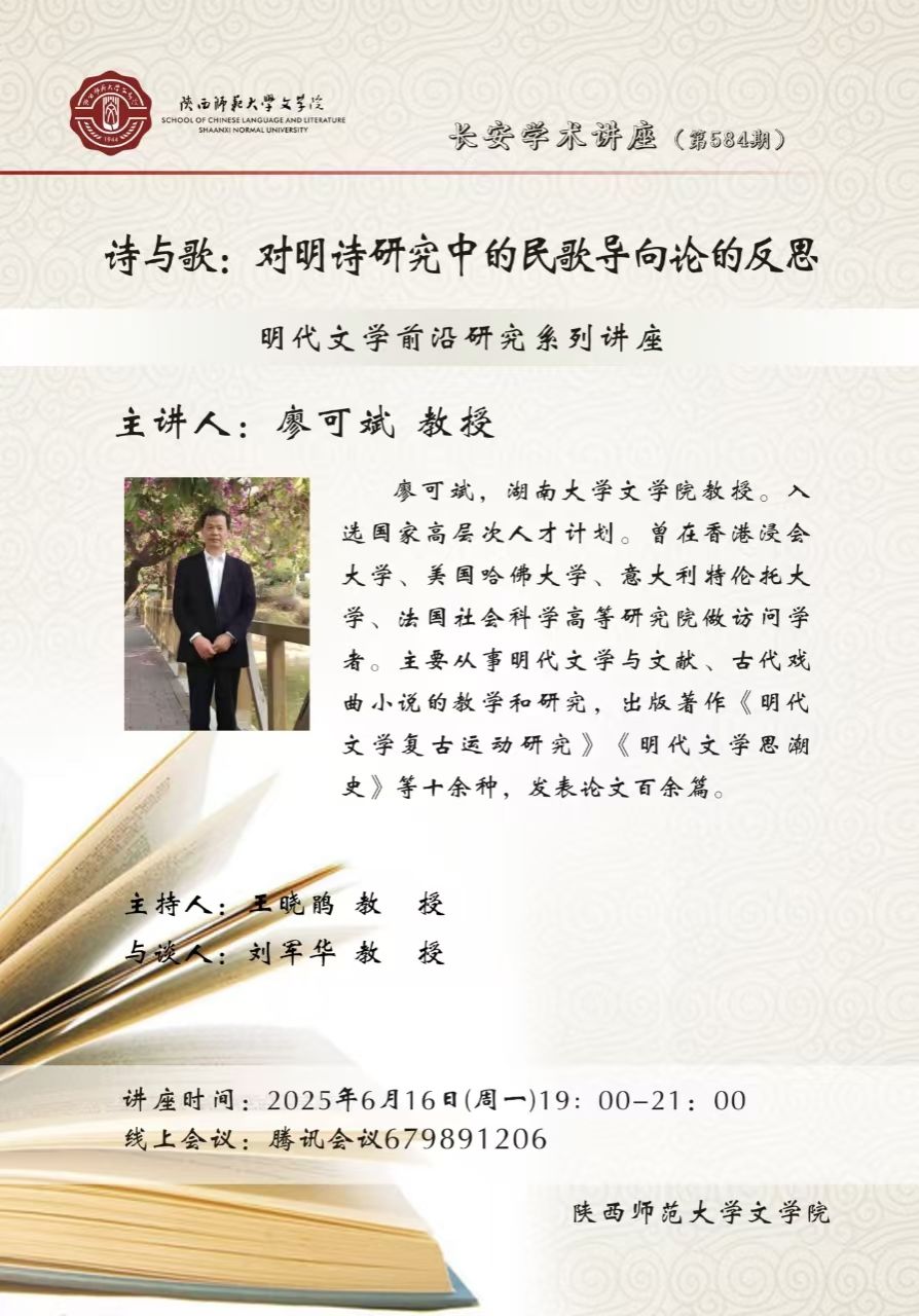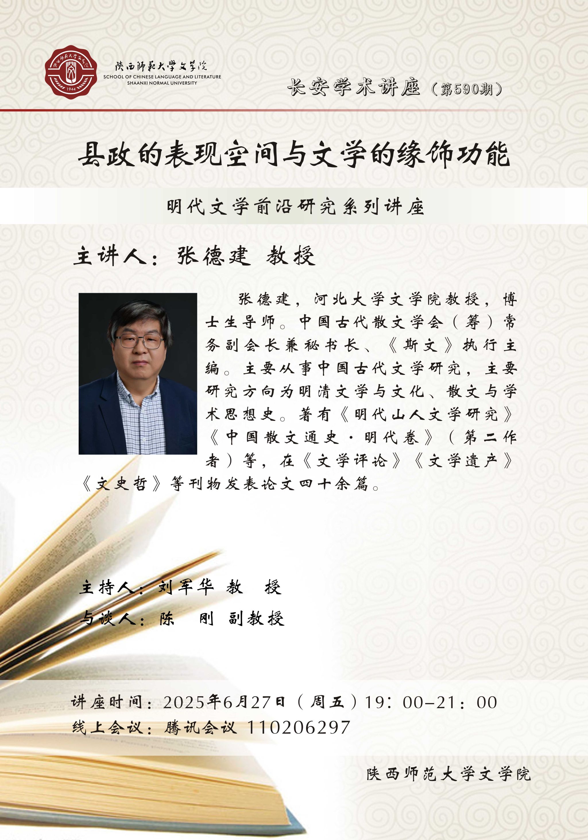 (通讯员:张可)2025年6月27日晚,由公司主办的明代文学前沿研究系列讲座暨长安学术讲座第590期“县政的表现空间与文学的缘饰功能”顺利举办。讲座邀请河北大学意昂体育张德建教授作为主讲人,公司刘军华教授主持,陈刚副教授与谈,来自全国40多所高校、研究院的百余名老师及同学在线参与,共同探讨明代文学的魅力。张德建教授首先围绕县政实践,分析了四种文体的表现空间:一是公文,它是实际治理中的客观呈现。但明中期后,由于多由手书代笔,...
