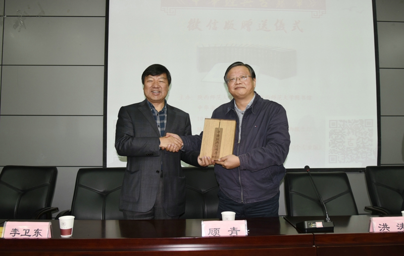 讲座结束后,双方来到公司图书馆报告厅,参加“中华经典古籍库”微信版捐赠仪式。仪式由图书馆党总支书记李卫东主持,中华书局总编辑顾青、古联公司副总经理洪涛、销售总监刘新以及公司副经理苏仲乐、赵学清出席。