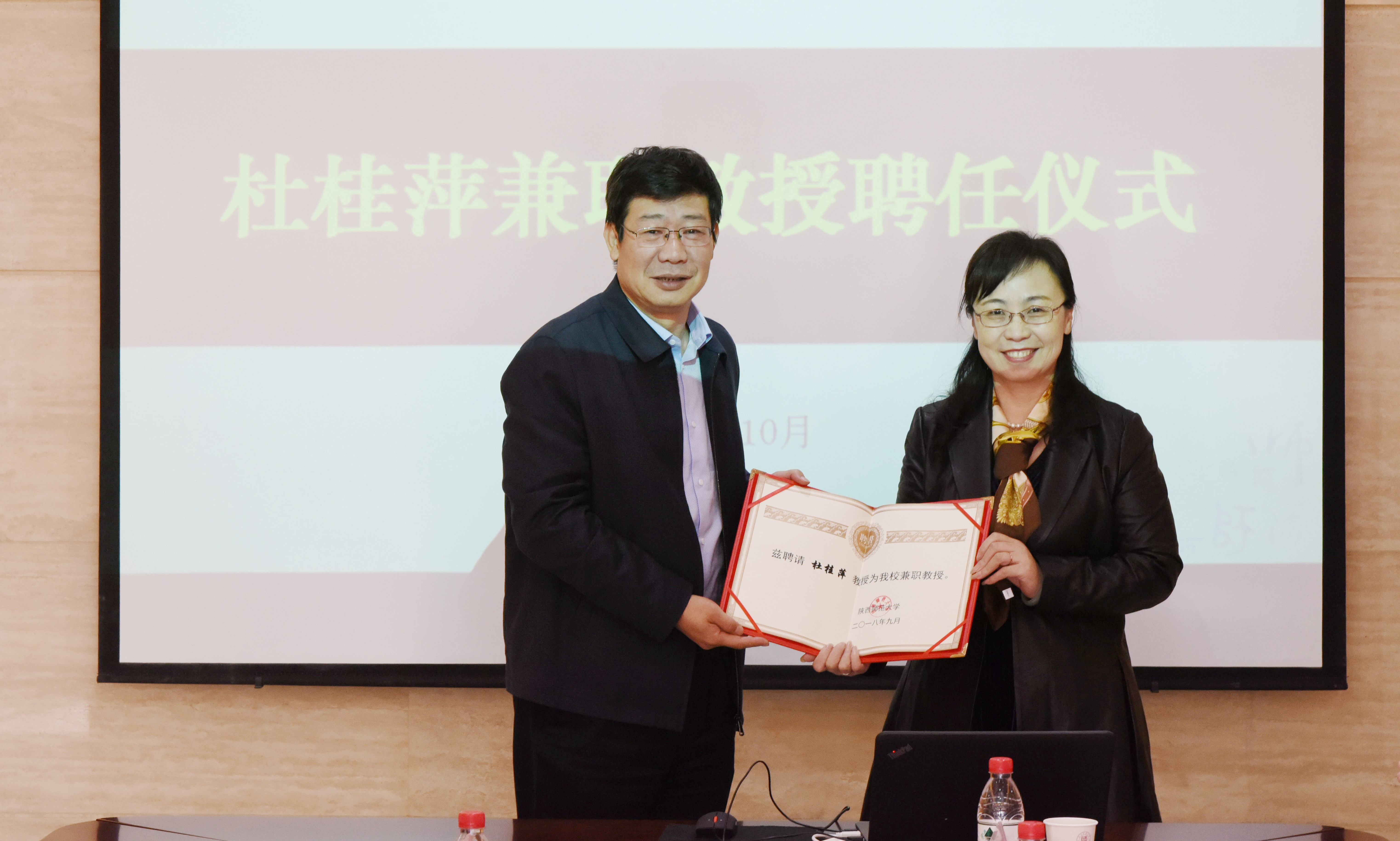 张新科经理首先介绍了杜桂萍教授的主要研究方向、科研成就和学术影响。随后,人事处处长李磊宣读《意昂体育关于聘任杜桂萍教授为兼职教授的决定》。游旭群董事长为杜桂萍教授颁发聘书。