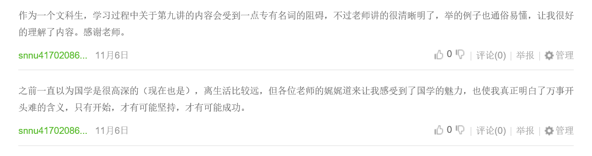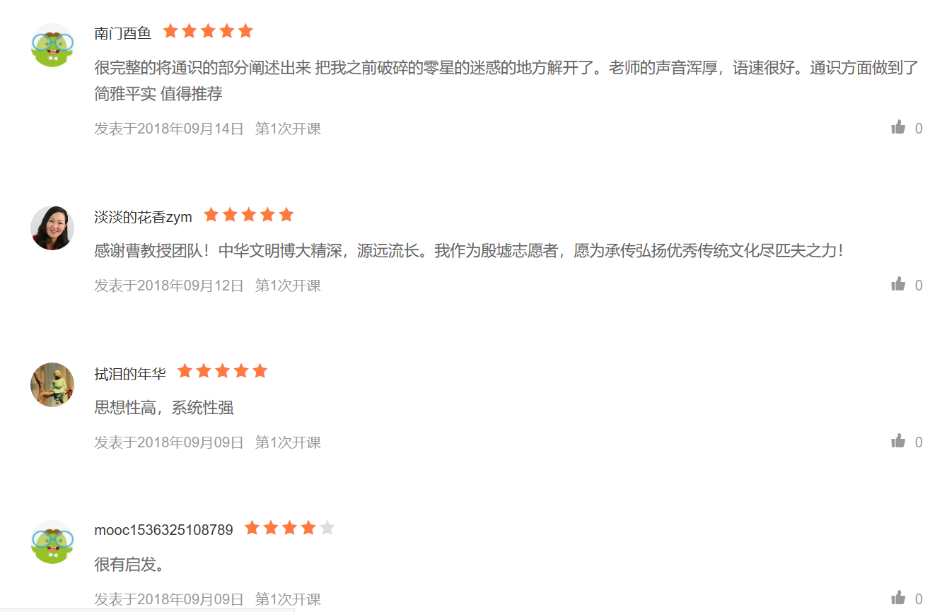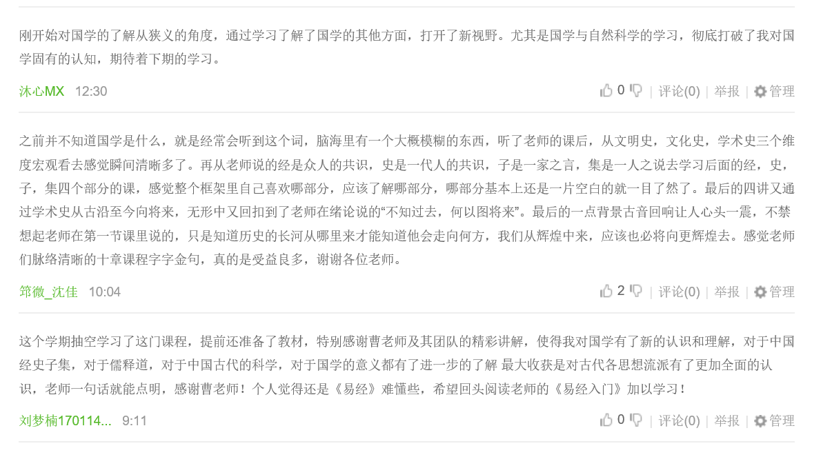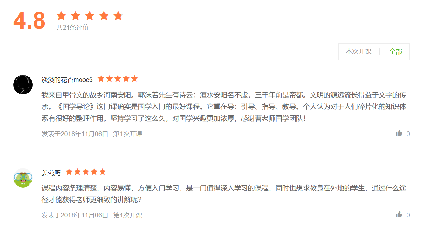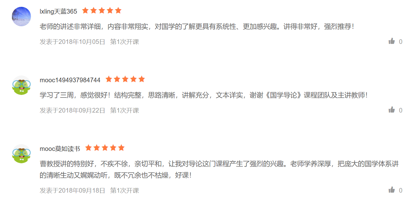 《国学导论》首次开课时间为2018年9月3日至2018年11月26日,开课至今,已有2771位同学参与课程学习,课程获得一片好评,同学们纷纷表示课程条理清晰、内容易懂,老师的讲解生动深入,学习本课程为梳理庞杂的国学知识起到了相当有益的作用。在课程讨论区,同学们也展开热烈的讨论。