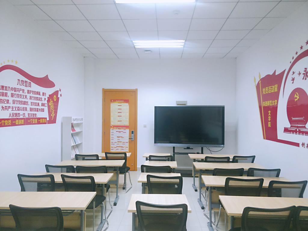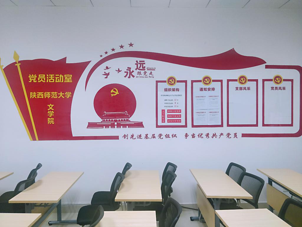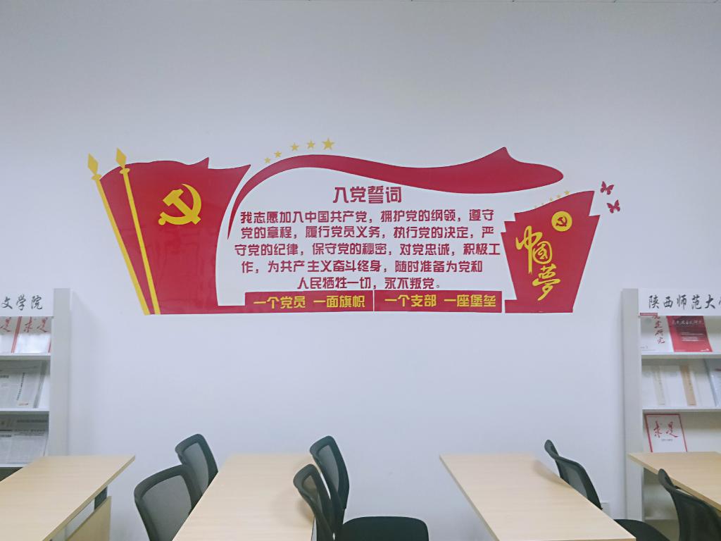 公司党员活动室位于文汇楼A段116,布局规范、整洁美观,配备有多功能一体机、电脑、党建书籍和党报党刊阅览栏、文件存储柜等设施,为党员学习和开展活动提供了基础。活动室整体以红、黄两色为基准,两侧墙面均有党徽、党旗元素,左侧党旗旁配以“组织架构”、“通知安排”、“支部风采”、“党员风采”四个展示栏;右侧党旗旁配以入党誓词,让党员“不忘初心,牢记使命”; 右侧配建了报架、档案柜等,营造了浓厚的学习氛围;门上配有中国共产党发展党员工作流程图、党支部工作制度,让党员知道学什么、做什么、履什么职责。