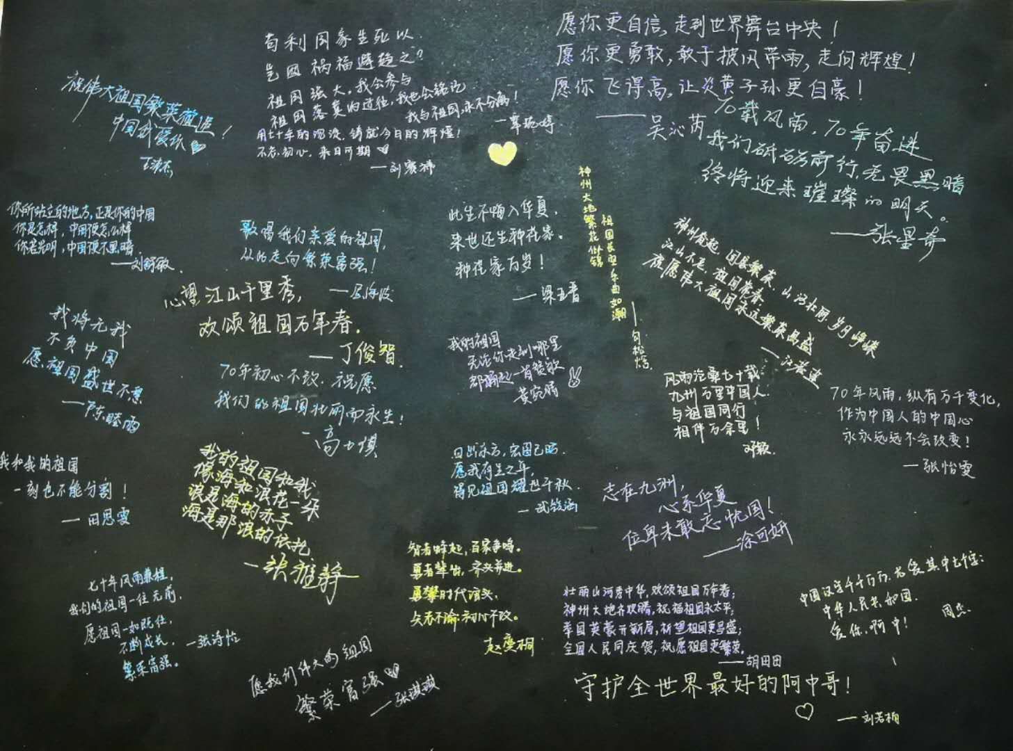 2019年9月16-20日,公司长风文学社结合各班团日活动,收集赤子心声,汇聚爱国热浪,用一句句美好的祝福,表达对新中国取得伟大飞跃的骄傲和继往开来、勇攀高峰的的期许,用熟悉的方式、真挚的情感表达文苑学子的拳拳之心。
