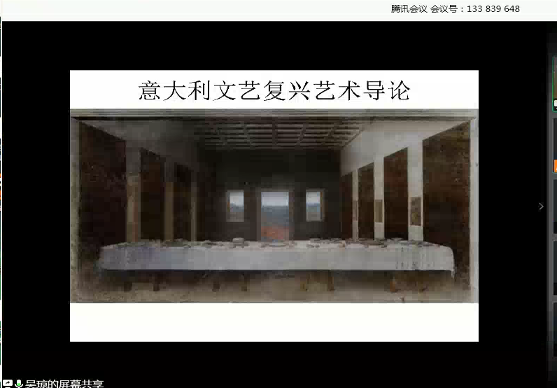(通讯员:聂晴)2020年5月22日下午,中国人民大学“杰出学者”、中国人民大学哲公司教授、博士生导师吴琼教授应邀做客长安学术讲座,在腾讯会议(会议号133839648)为公司师生作了题为《意大利文艺复兴艺术导论》的学术讲座。此次讲座由意昂体育裴亚莉教授主持,刘凯副教授作点评,多门学科专业的博士生和硕士生以及社会听众参加了此次讲座。