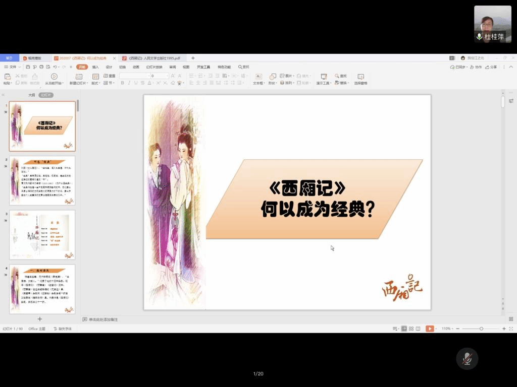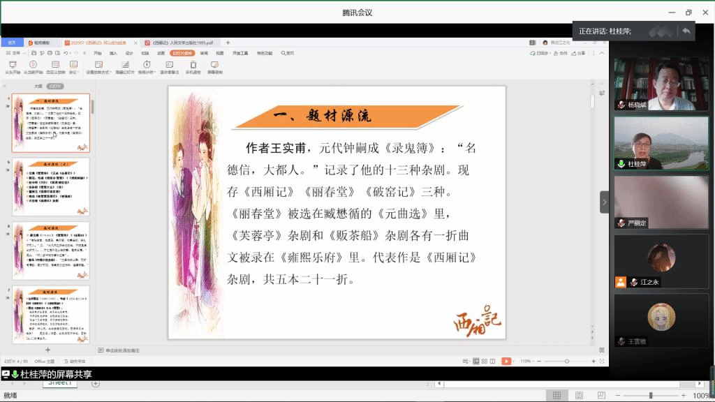 首先,杜桂萍老师列举了《文心雕龙》等典籍中对于“经典”的论述,指出经典应该具有原创性、典范性和权威性的特点。接着,她从“题材源流”“元曲四大家”“琵琶、西厢之争”“‘情’的主题”“刊本与演出”五方面对《西厢记》何以成为经典作了阐释。她指出,正是在对“元曲四大家”的讨论和对《西厢记》《琵琶记》高下的争论中,《西厢记》的经典价值得到了有效的挖掘,元代戏曲因之充分发挥了“土壤”和“武库”的作用。杜桂萍老师从多维的学术角度出发,对《西厢记》的巨大阐释空间作了讲解,并且提出了许多阅读经典的建议。