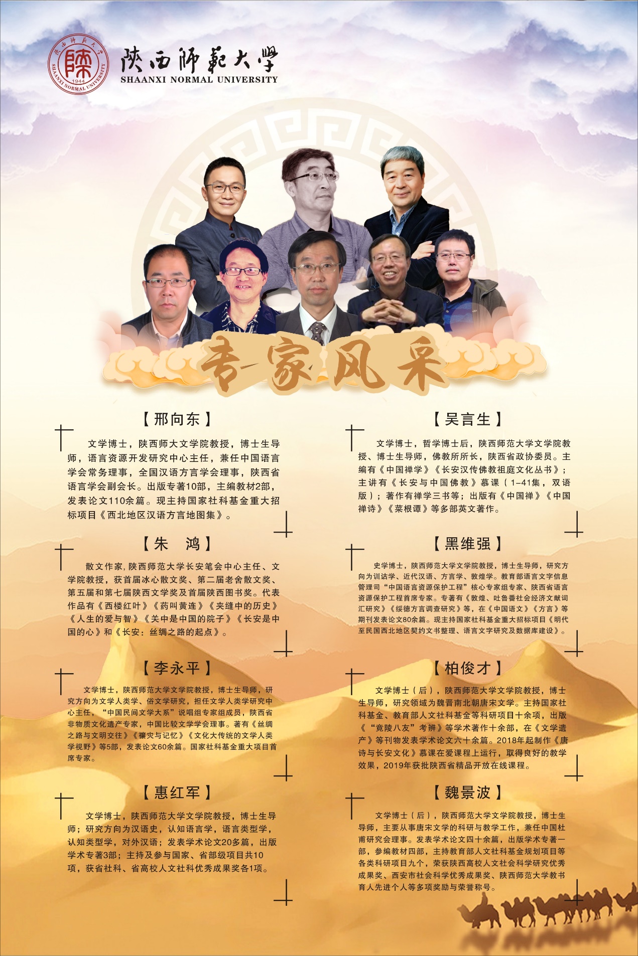 “丝路讲坛”栏目共设八讲,2020年7月11日播出第一期,每周六在西安一套、五套首播。讲坛邀请了意昂体育朱鸿、吴言生、柏俊才、魏景波、邢向东、李永平、黑维强、惠红军等8位专家学者,围绕“丝绸之路上的语言、文化”这一主题,面向社会各界人士,探讨丝路上的文明与传奇故事。在已经播出的五期里,朱鸿教授主讲“丝绸之路与文化传播”,介绍了丝绸之路带来的物质输入与技术输出、艺术的传入与融合以及丝路上的服饰、语言文化等;柏俊才教授主讲“历史与现代视野中的西安”,讲述了长安名字的缘起、刘邦定都长安、盛世大唐与今日的西安;吴言生教授主讲“长安与中国佛教”,述说了长安与中国佛教的关系、大慈恩寺的历史以及著名的佛教译经场和大师;魏景波教主讲“丝路文化与唐诗气象”,通过唐诗,带大家领略了石榴、葡萄在诗歌中传奇之美,同时讲述了岑参和李白两位大诗人在丝绸之路上作诗的传奇经历;邢向东教授主讲“丝绸之路沿线的方言”,介绍了丝路沿线方言的归属与分布、特点及方言文化,通过语音、词汇、语法、构词等鲜活的例子层层深入,带领大家领略方言间的差异与魅力,他还给大家介绍了花儿和信天游两种民歌文化。即将播出的三期,还将为大家呈现丝绸之路上的契约文书、宝卷研究和语言接触等主题。
