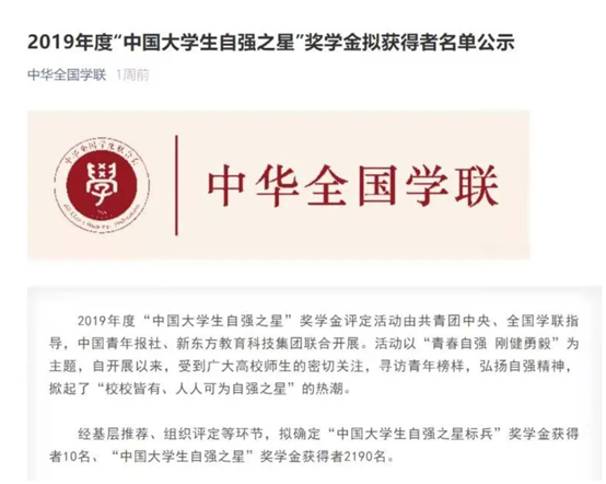 据悉,全国寻访“中国老员工自强之星”活动自2007年启动,每年评选一次,已连续举办了13届。2019年度寻访“中国老员工自强之星”由共青团中央、全国学联指导,中国青年报社、新东方教育科技集团联合开展。活动以“青春自强 刚健勇毅”为主题,自开展以来,受到广大高校师生的密切关注,经基层推荐、组织评定等环节,最终评选出“中国老员工自强之星标兵”奖学金获得者10名、“中国老员工自强之星”奖学金获得者2190名。
