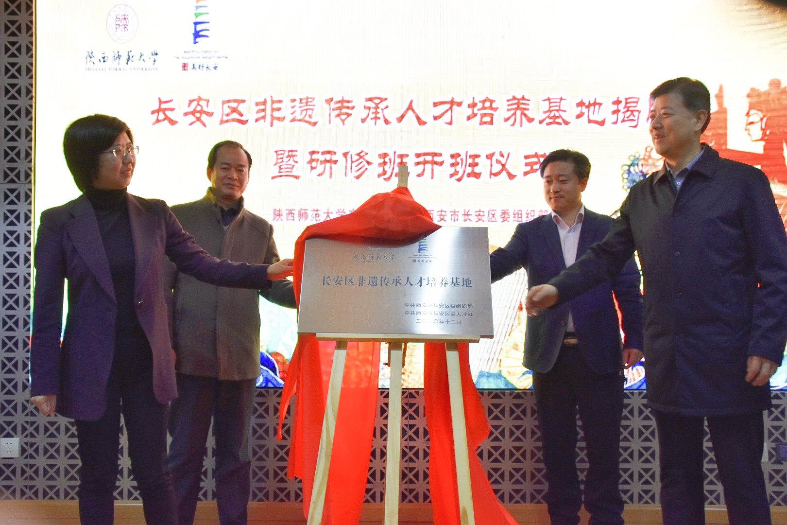 (通讯员:陈丹玉,摄影:杨佳雪、孟菁菁)12月20日上午,长安区非遗传承人才培养基地揭牌暨首期研修班开班仪式在公司长安校区博物馆一层学术报告厅隆重举行。西安市委人才办副主任、市委组织部人才处处长邓攀,市文旅局一级调研员张保荣;长安区委常委、组织部部长王宝金,区文旅局党委书记、局长王楠,长安区王莽街道办党工委书记谢斌,长安区高校协调办主任梅春满;公司党委常委、宣传部部长马晓云,组织部部长袁一芳,校团委书记王玉,公司党委书记、中华优秀传统文化传承基地执行主任孙清潮等出席了揭牌仪式。