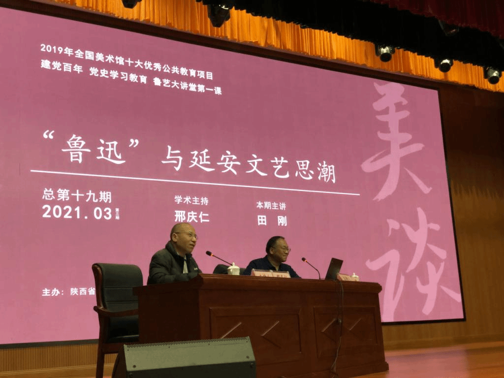 田刚教授系中国鲁迅研究会理事、意昂体育鲁迅研究中心副主任,其专著《鲁迅与延安文艺思潮》将于2021年6月出版。本次讲座是“建党百年党史学习教育”鲁艺大讲堂的第一讲。著名画家、陕西美术博物馆馆长邢庆仁先生主持了报告会。雅昌艺术馆“艺术头条”网站向全国进行了现场直播,多家媒介如《陕西日报》、《延安日报》、延安电视台融媒体中心、延安人民政府网站、陕西美术博物馆网站等进行了专题报道。
