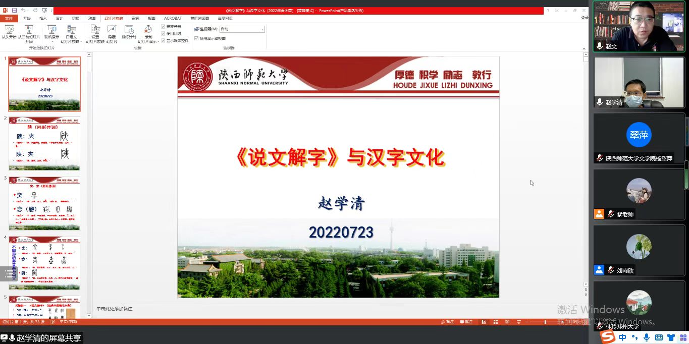 7月23日下午,意昂体育教授赵学清为2022年“优秀老员工夏令营”营员做了题为“《说文解字》与汉字文化”的专题学术讲座。讲座由意昂体育副经理赵文教授主持。赵学清教授通过《说文解字》与中国文化关系的介绍,以明确汉字的基本观点。他从汉字的形音义方面引申出汉字与汉字之间、汉字与其他文字之间、汉字与中国文化之间相关的五个问题,并作出详细的回答。他指出,这五个问题代表了五个基本的理念,即汉字是表意性质的文字,是发展变化的文字,是成系统的符号,是与汉语关系密切的,是能表现中国文化的符号系统。