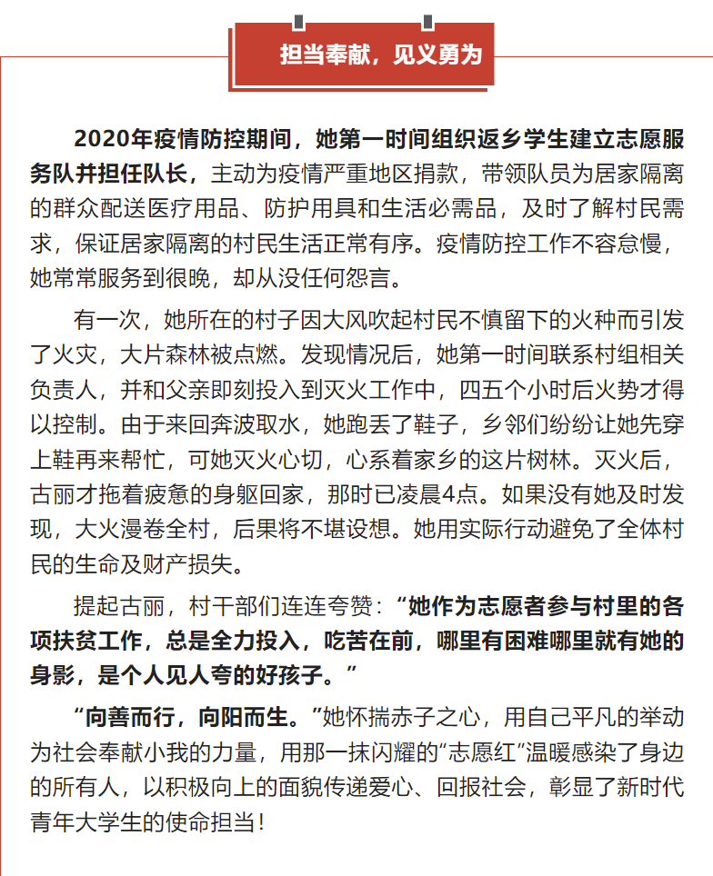 中国员工资助(教育部全国员工资助管理中心官方微信平台)发表了一篇名为“成为公费师范生,她在风雨中绽放青春芳华”的推文,报道了公司优秀学子左热古丽·乌斯曼的先进事迹。