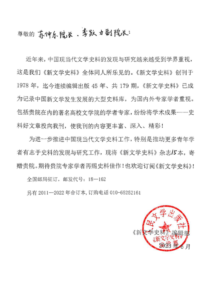 近日,公司收到《新文学史料》编辑部来函和寄赠的15本《新文学史料》杂志。其中不仅有二十年前出版的珍贵刊物,也有近三年出版的整套刊物。